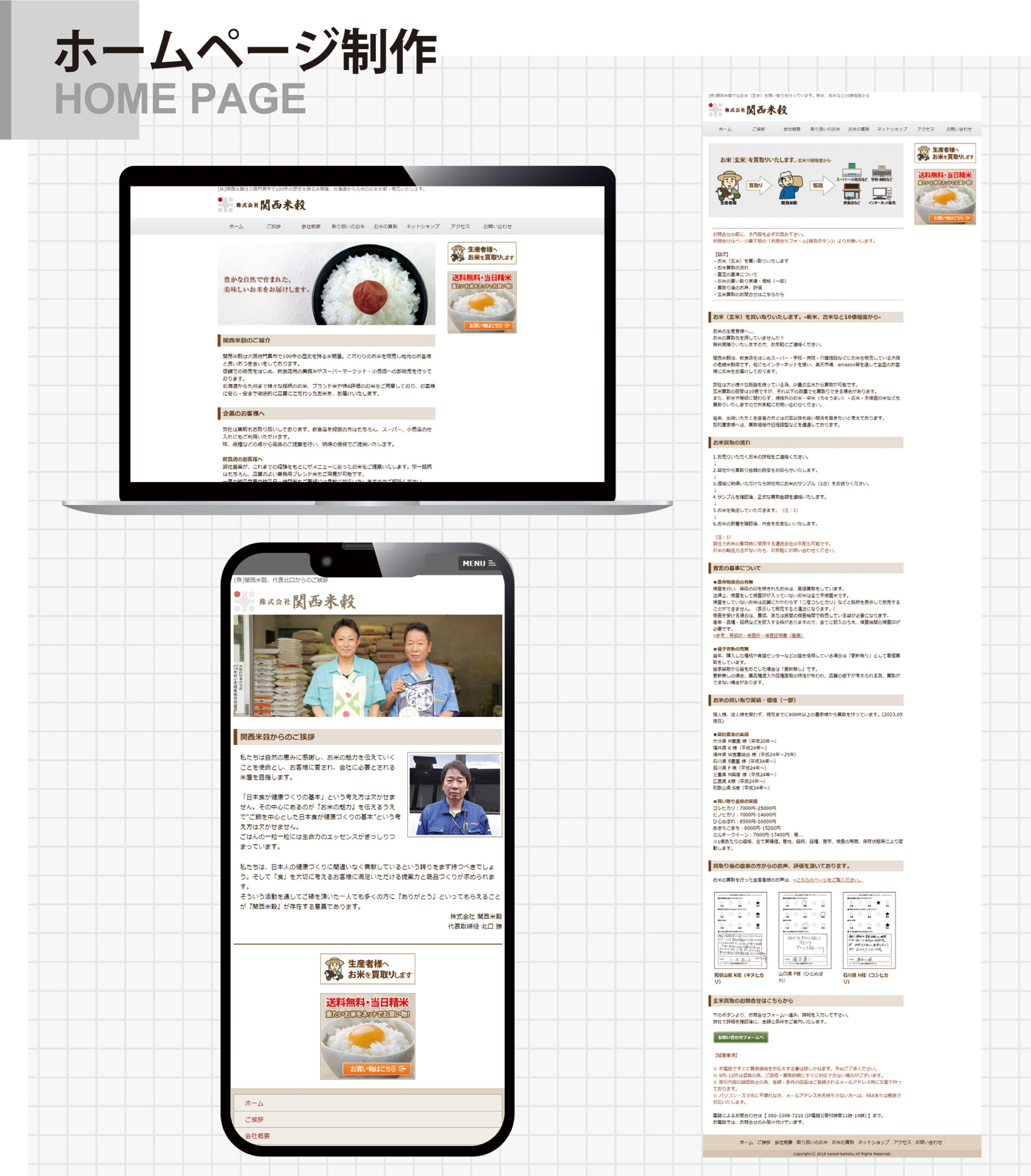 ホームページ制作 WEB ホームページ 関西米穀の企業ホームページ [概要]勤務先のHPを静的サイトで構築。スマートフォン普及時にリキッドレイアウト対応済。最低限の情報サイトであるが高品質の写真を使用して閲覧者への信頼感を演出した。途中「玄米買取」のページを追加提案し、広告運用・実務対応も担当して大幅な原価率削減に貢献した。後に本コンテンツは同業にそっくり模倣されるほど良質な内容であった。 サイズ960px×∞px作成日2012.02.01頃制作時間不明使用ソフト